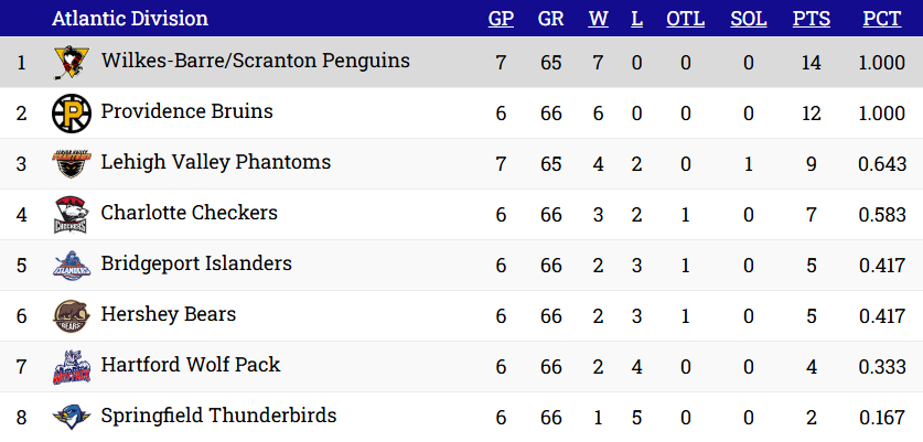 Wilkes-Barre/Scranton and Providence square off for an early-season heavyweight bout. Both the Penguins and P-Bruins are undefeated, two of three remaining unbeaten teams in the AHL. The Bruins lead the league in goals for per game (4.76), while the Pens top the AHL in goals against per game (1.43).